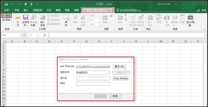 打开任意Excel表格,会发现Excel功能区多了“SAP CLOUD FOR CUSTOMER”,在此功能区下,点击“登录”,会弹出登录SAP Cloud for Customer窗口。请按照如下内容填写登录: