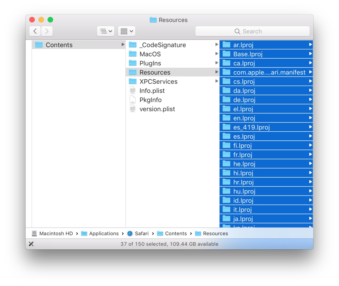 要知道一个应用都支持哪些界面语言,可以在 Finder 中找到该应用,点击右键选择 显示包内容,然后查看 /Contents/Resources 目录下以 .lproj 结尾的语言文件目录;.lproj 之前的部分就是各语言对应的地区代码。
