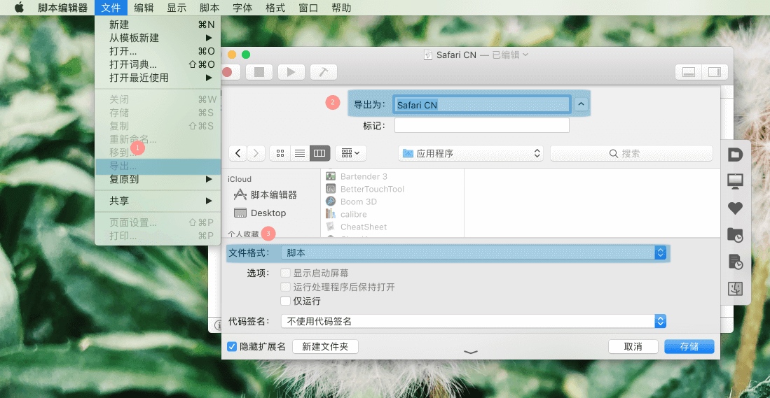 点击 文件 > 导出,起一个易认的名字(例如「Safari CN」),并将「文件格式」选为「脚本」,然后将其导出到 Applications 文件夹。